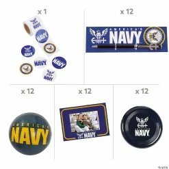Anchors aweigh! This fun assortment of Navy picks is perfect for a military appreciation function or as giveaways to potential recruits at school. Show off your Naval pride with these Navy pens, stickers, toys and more. Stock up on these picks for swag at community events honoring local heroes. (148 pcs. per unit) Assortment may vary.• Official Licensed Product of the U.S. Navy• By federal law, licensing fees paid to the U.S. Navy for the use of its trademarks provide support for the Navy Trademark Licensing Program, and net licensing revenue is devoted to U.S. Navy Morale, Welfare and Recreation programs. U.S. Navy name, trademarks and logos are protected under federal law and used under license by Oriental Trading. Includes:• 12 Plastic America’s Navy® Flying Discs (9″ diam.)• 12 Metal America’s Navy® Pen & Bookmark Sets (5 1/2″ with 2″ x 6″ cardstock bookmark. Black ink.)• 12 Vinyl America’s Navy® Picture Frame Magnets (7″ x 5″ with 4 1/4″ x 2 3/4″ photo space.)• 1 America’s Navy® Sticker Roll (100 stickers per roll. 1 1/2″)• 12 Foam America’s Navy® Stress Balls (2 1/4″)