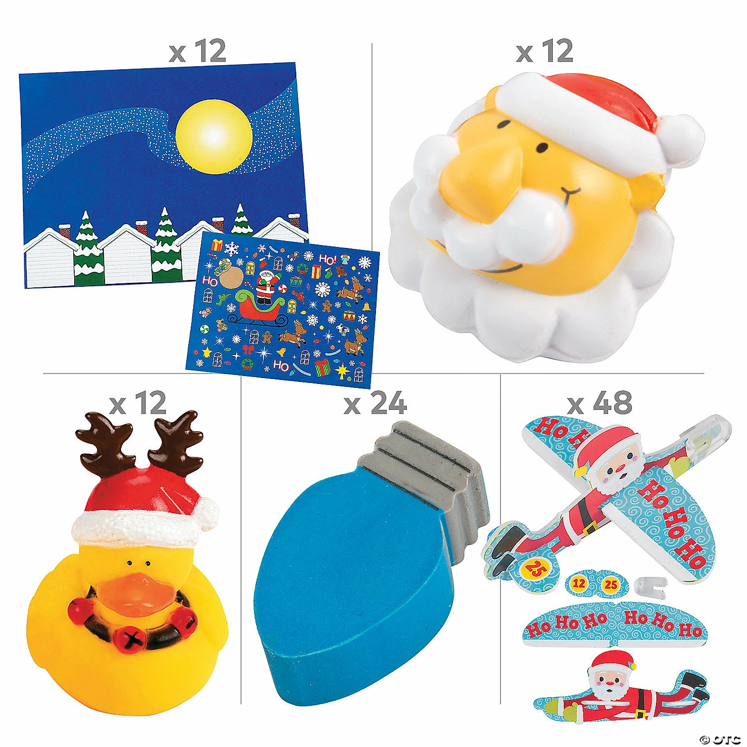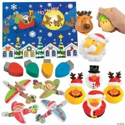 These fun toys will spread Christmas cheer to kids of all ages! This convenient kit is packed with an assortment of Christmas novelties and is great for holiday parties, stocking stuffers and classroom prizes. You can also hand these out as giveaways for Santa visits and other community events. Simply add these party favors to Christmas goody bags from this website! (108 pcs. per unit)Includes:β’ 48 Vinyl Stretchy Flying Elves (3 1/2″)β’ 12 Foam Holiday Character Stress Toys (3″)β’ 12 Vinyl Holiday Rubber Duckies (Assorted styles. 2″ Duckies do not float upright.)β’ 24 Rubber Lightbulb Erasers (1 1/2″)β’ 12 Paper Merry Christmas To All Sticker Scenes (Includes 12 11″ x 8 1/2″ backgrounds and 12 sticker sheets. Stickers are repositionable and acid free.)β’ Assortments are subject to change at any time and may vary from picture shown. Substituted items will be similar in nature.