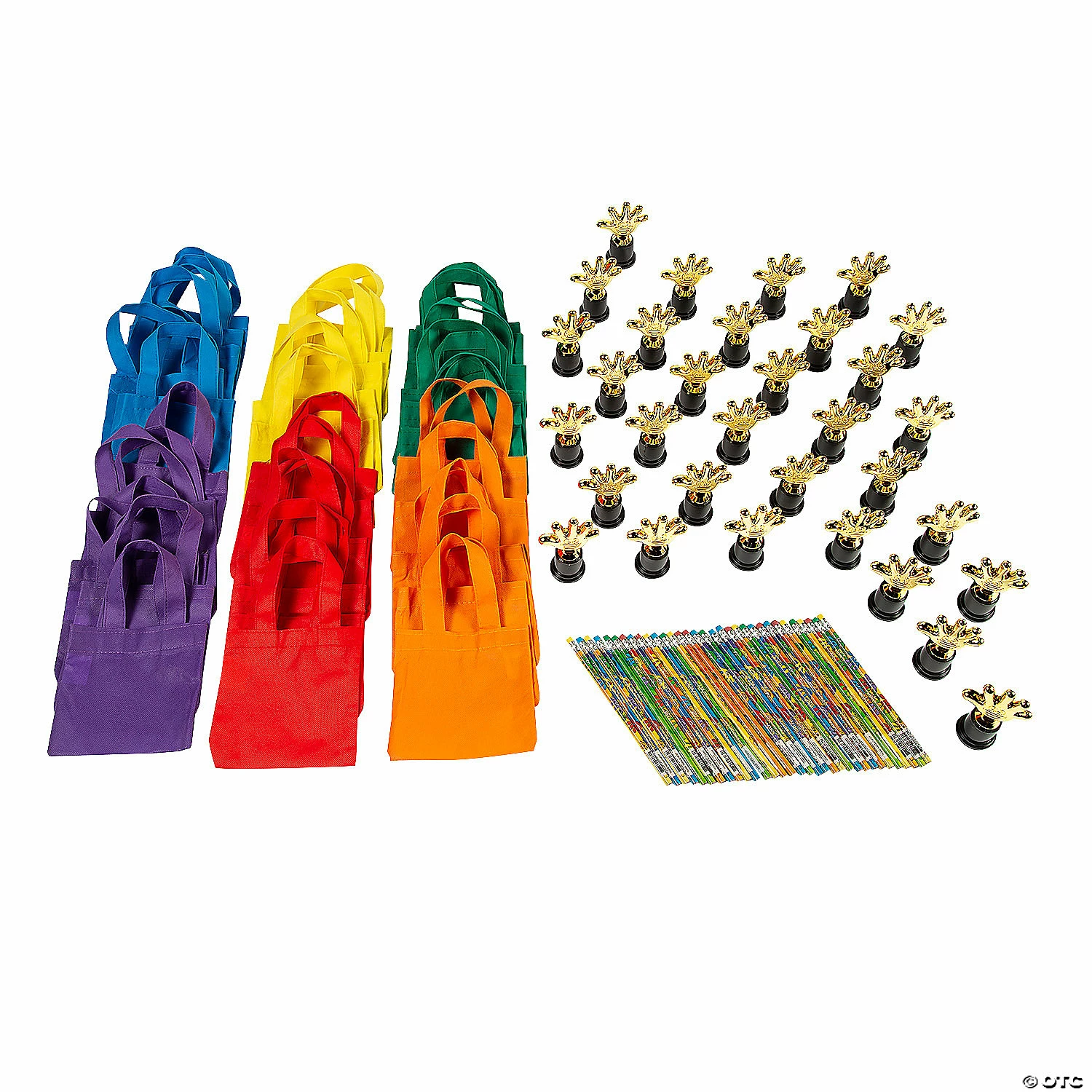 Fill these tote bags with the included bookmarks, pencils and trophies for DIY swag bags that will delight your students! Essential school supplies combined with fun treats are a great way to encourage kids to keep up the good work. Hand them out as rewards, Halloween treats or just as a way to show your children that you appreciate their best efforts! Enough for 30 students. Pencils have #2 lead. (120 pcs. per unit) Assortment may vary. Simple assembly required. Β© OTC