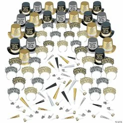 Opulent New Yearβs Eve Party For 100. Get all your New Year’s party gear right here! Don’t waste time running around town gathering accessories and favors for all your guests to enjoy. This Opulent New Year’s Eve Party kit has enough party supplies to help up to 100 guests usher in the New Year in an unforgettable way. Includes 50 paper glitter top hats, 50 paper glitter tiaras, 25 foil squawkers, 25 paper foil horns and 50 paper blowouts. 91/2″ hats, 51/2″ x 41/2″ tiaras, 8″ horns, 31/2″ blowouts. One size fits most. (200 pcs. per unit) Colors may vary.
