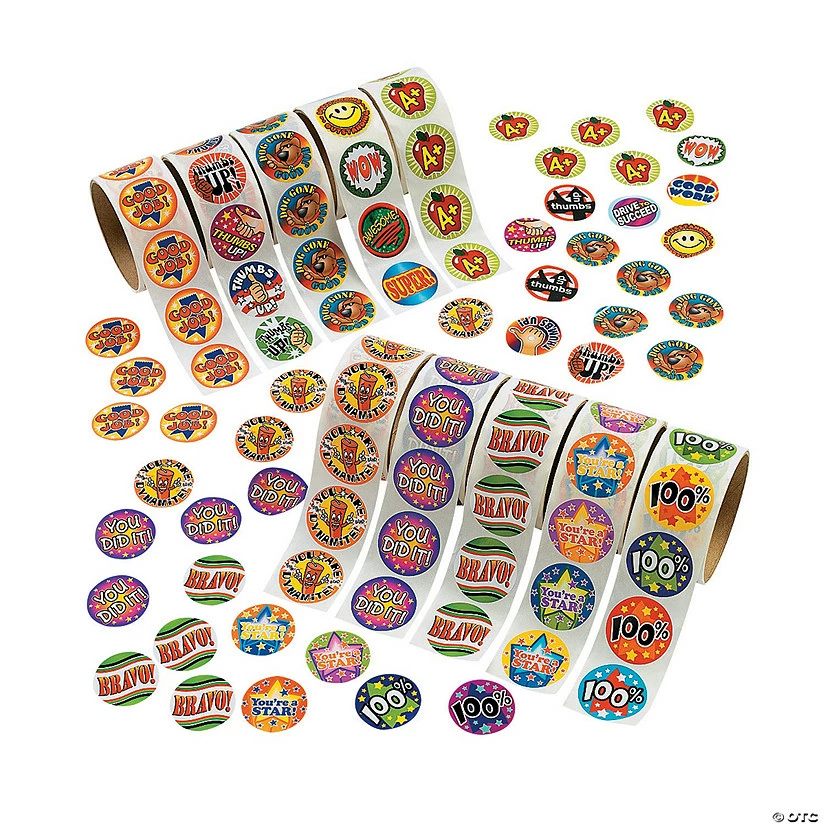 Reward Sticker Assortment. This fun sticker assortment is a school teacher’s best friend! Kids love earning stickers for good classroom behavior, scholastic excellence and more! (100 stickers per roll, 10 rolls per unit, shrink-wrapped) 1 1/2″ Assortment may vary. Β© OTC