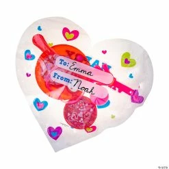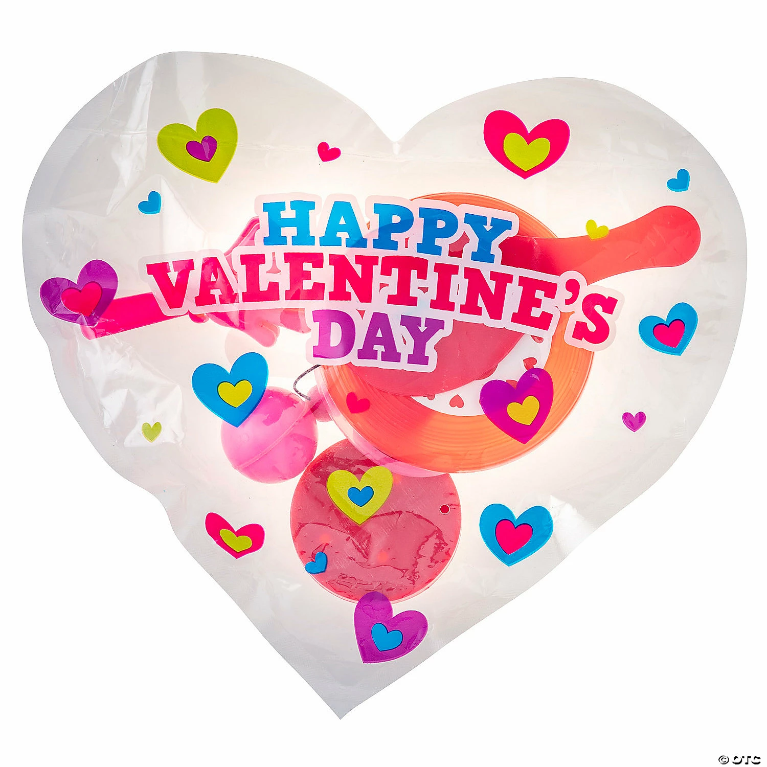 This heart-shaped bag has a βHappy Valentineβs Dayβ message along with colorful heart images. The To/From space on the back of these heart-shaped bags make them perfect as kidsβ giveaways for Valentineβs Day. Filled with Valentineβs Day themed toys, these bags are also great as party favors or for Valentine exchanges. Each bag has 8 toys and a To/From space. Plastic. Bag, 9″ x 9 1/2″. Β© OTC