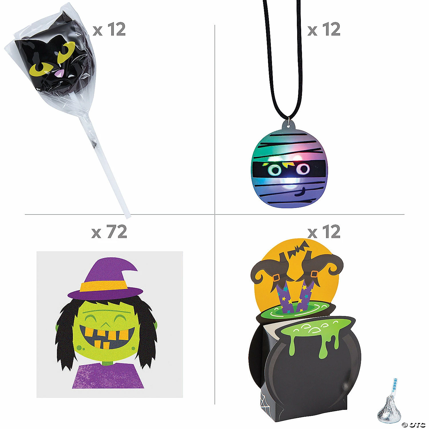 Little boos and ghouls will be spellbound by these bewitching Halloween party favors perfect for home, school or community events. Also great for use as trick-or-treat handouts as well as trunk-or-treat giveaways, this kit is chock full of fun that’s too cute to spook! (108 pcs. per unit)Includes:• 12 Black Cat Character Suckers (Includes a 1 3/4″ sucker on a 4″ plastic stick. Mixed fruit flavor. Individually wrapped. Fat-free. Total wt., 7 oz.)• 12 Ghoul Gang Light-Up Necklaces (Includes three settings. Each 2” rubber pendant is on a 24″ breakaway cord. Batteries included.)• 72 Paper Halloween Glitter Temporary Tattoos (Easy to apply and remove. Safe and non-toxic. 1 1/2″)• 12 Cardstock Halloween Witch’s Cauldron Treat Boxes (4″ x 2″ x 6 1/2″ Simple assembly required.)• Candy is non-returnable. For more information, visit our “Return Policy” page located on our website.• Ingredient, nutrition, allergen and other product information are provided on our Web and Mobile sites for reference purpose only, without warranty or representation as to accuracy. Manufacturers adjust their labeling regularly and are solely responsible for the accuracy of the information. For general questions concerning these items, please contact our customer service at 800-228-0475.• Assortments are subject to change at any time and may vary from picture shown. Substituted items will be similar in nature.
